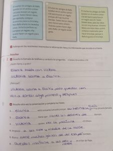 | ¿Quieren comprar algo? Un regalo para Rafa Aber was? Para el cumple Blanca debe hacer los deberes El niño entiende bien pero no contesta a lo que le preguntan | ¿En el centro comercial? ¿Es lógico? ¿Porque no quedan en la sala? Tienen que comprar cosas para decorar – | Jugar pádel? Rafa quere ver a Vicky y Blanca und zwar den neue Film, wie gesagt? „La nueva peli“ y Victoria que quiere ? Jugar al pádel Hoy cuando quedan a las 12 en el polideportivo |